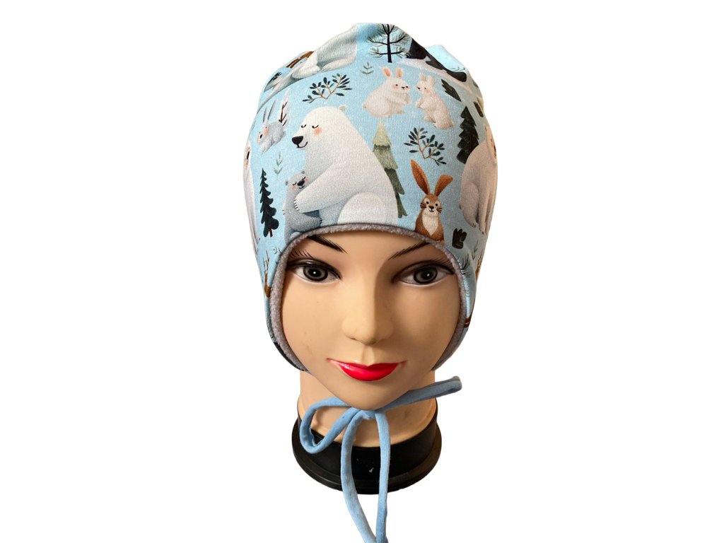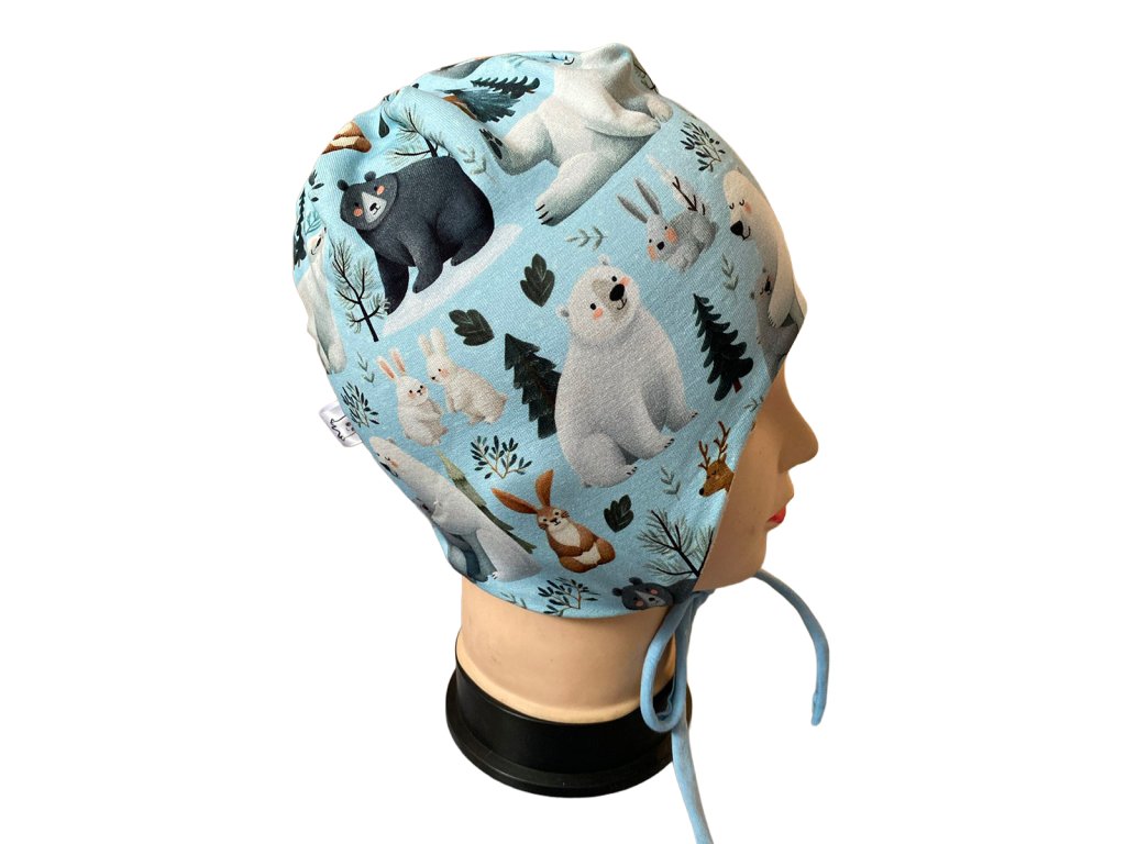 Dětská čepička s prodloužením přes uši a zavazováním – světle modrá s ledními medvědy