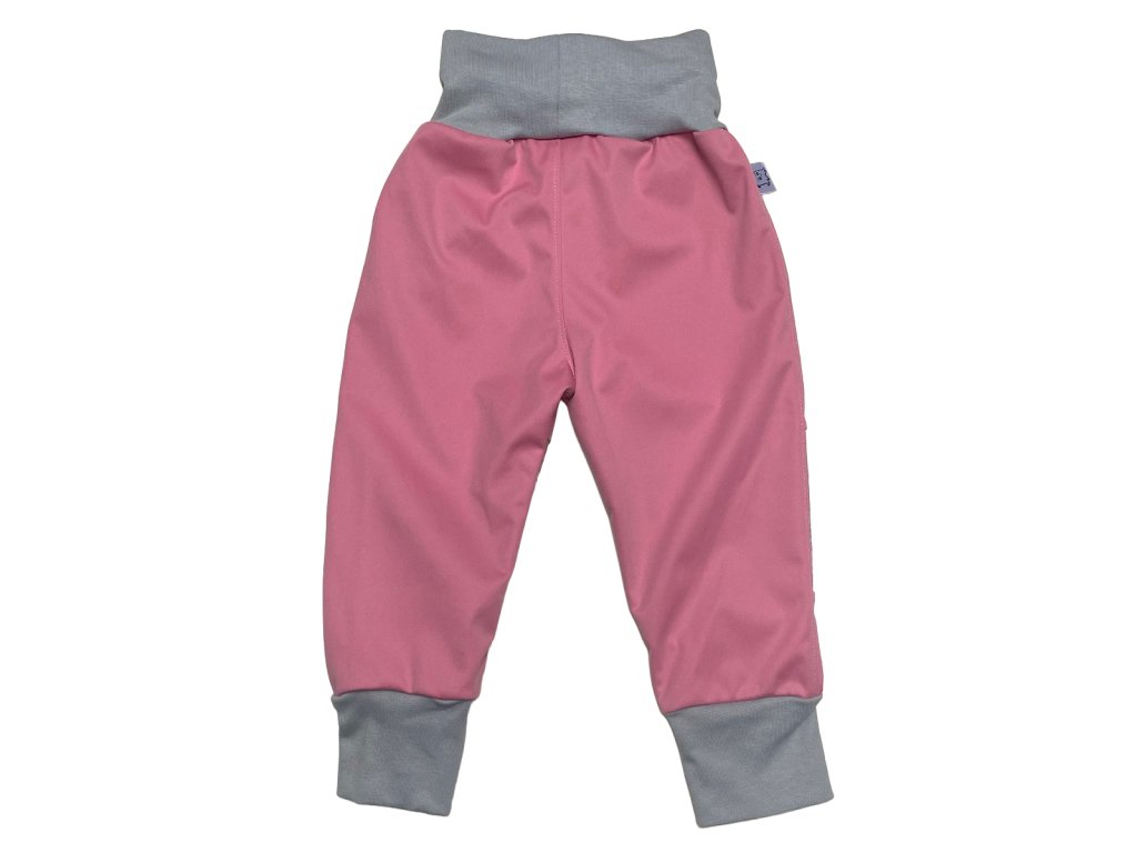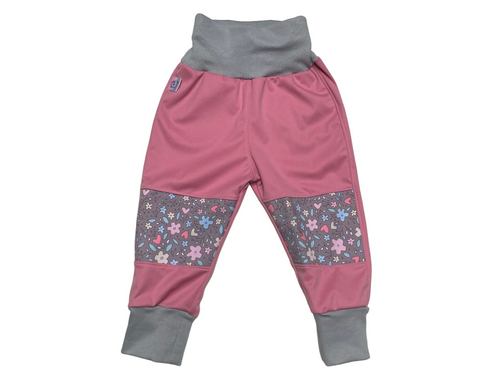 Dětské rostoucí softshellové kalhoty s fleecem – růžová a šedá s květinkami