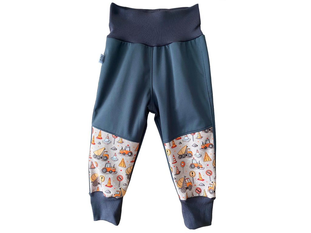 Dětské rostoucí softshellové kalhoty s fleecem – Šedé kalhoty se stavebními auty na kolenou