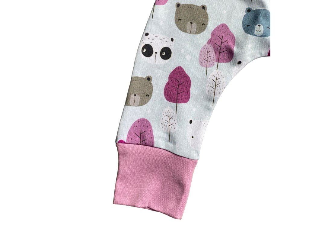 Rostoucí baggy kalhoty pro miminka a batolata – světle růžové náplety s medvídky v lese
