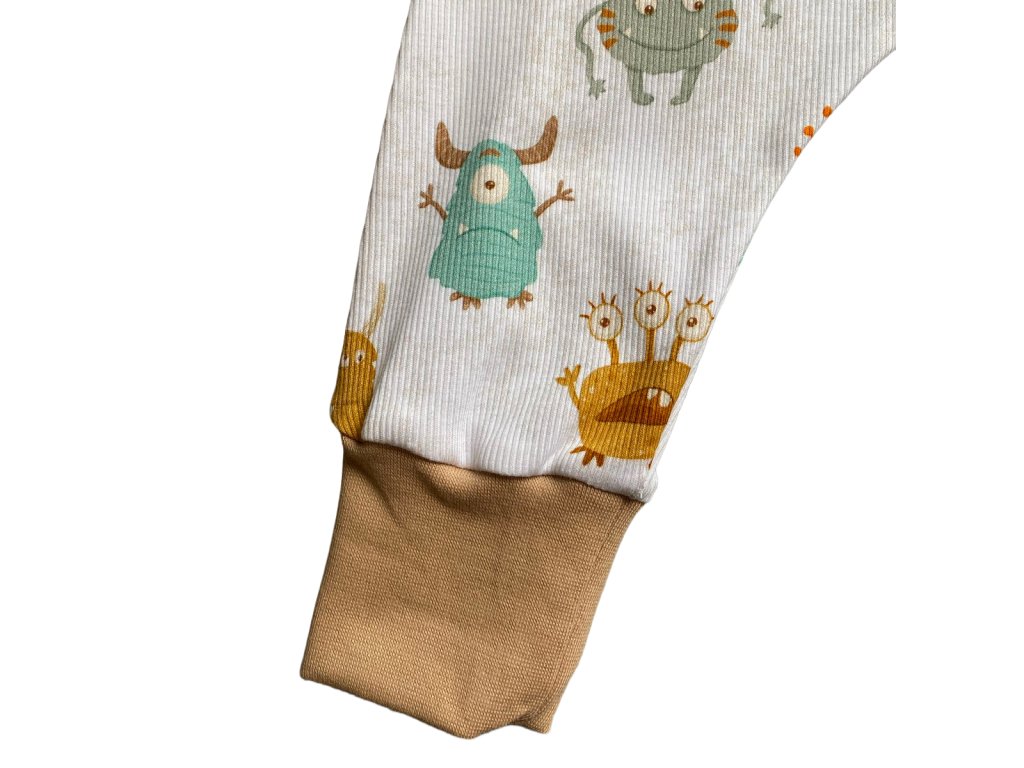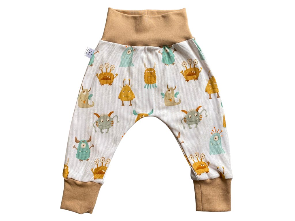 Rostoucí baggy kalhoty pro miminka a batolata – béžové náplety s příšerkami