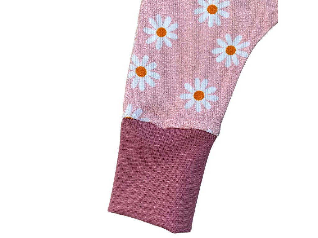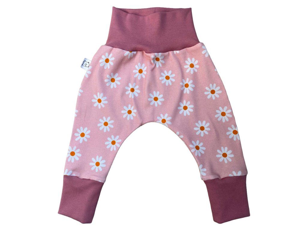 Rostoucí baggy kalhoty pro miminka a batolata – růžové náplety se sedmikráskami
