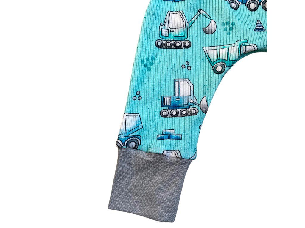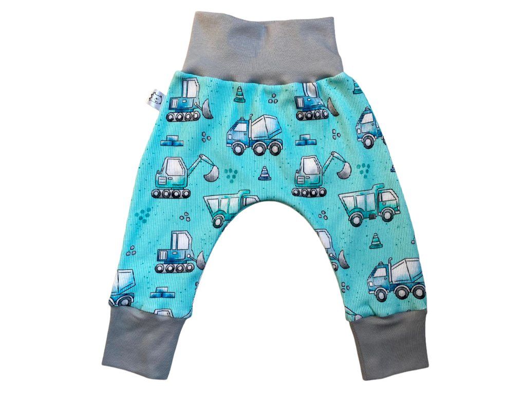 Rostoucí baggy kalhoty pro miminka a batolata – světle modrá se stavebními auty