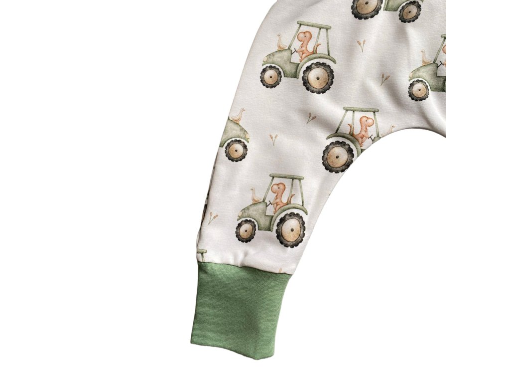 Rostoucí baggy kalhoty pro miminka a batolata – zelené náplety + traktůrky