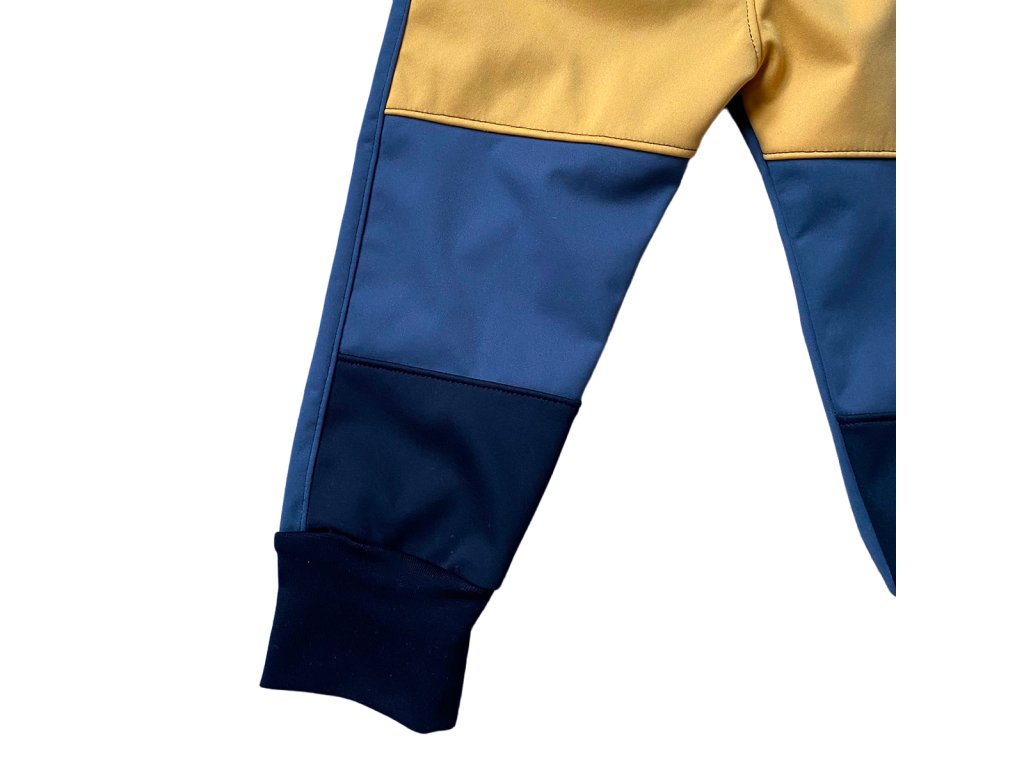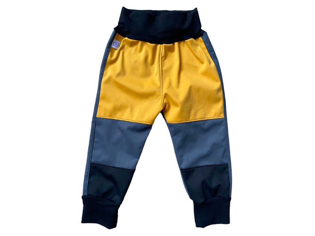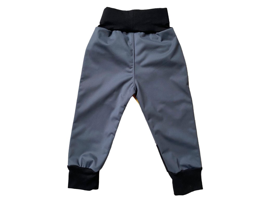 Dětské pružné rostoucí softshellové kalhoty s fleecem - šedé / černá / hořčicová.