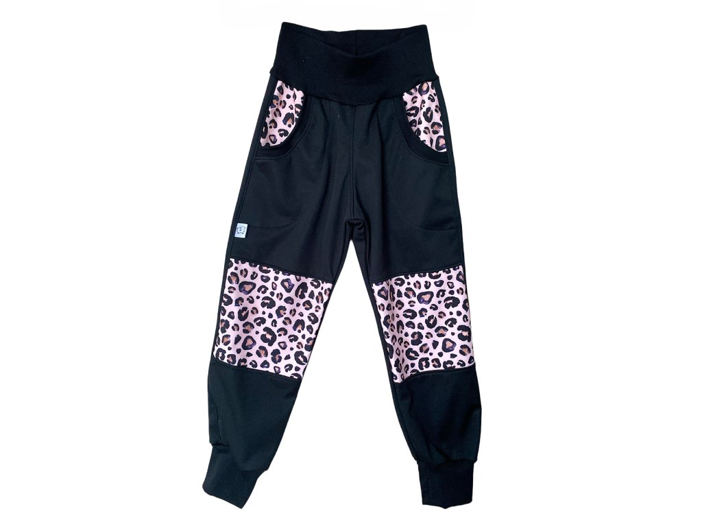 Dětské pružné rostoucí softshellové kalhoty s fleecem a s kapsami - ČERNÉ SE VZOREM SRSTI LEVHARTA NA RŮŽOVÉ.