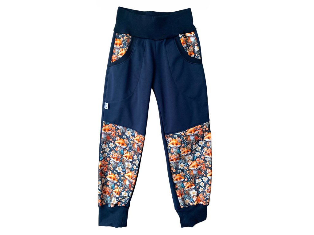 Dětské pružné rostoucí softshellové kalhoty s fleecem a s kapsami - tmavě modré s liškami.