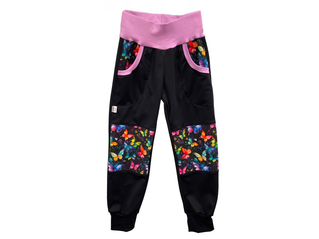 Dětské pružné rostoucí softshellové kalhoty s fleecem – ČERNÉ s MOTÝLKY