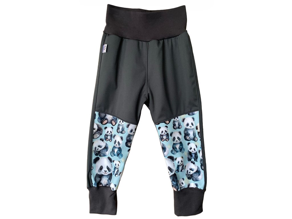 Dětské pružné rostoucí softshellové kalhoty s fleecem – šedé s pandami na světle modré
