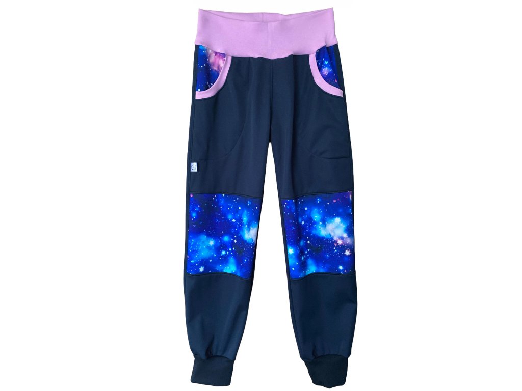 Dětské pružné rostoucí softshellové kalhoty s fleecem – tmavě modré s vesmírem