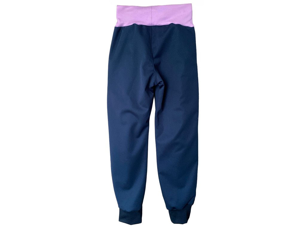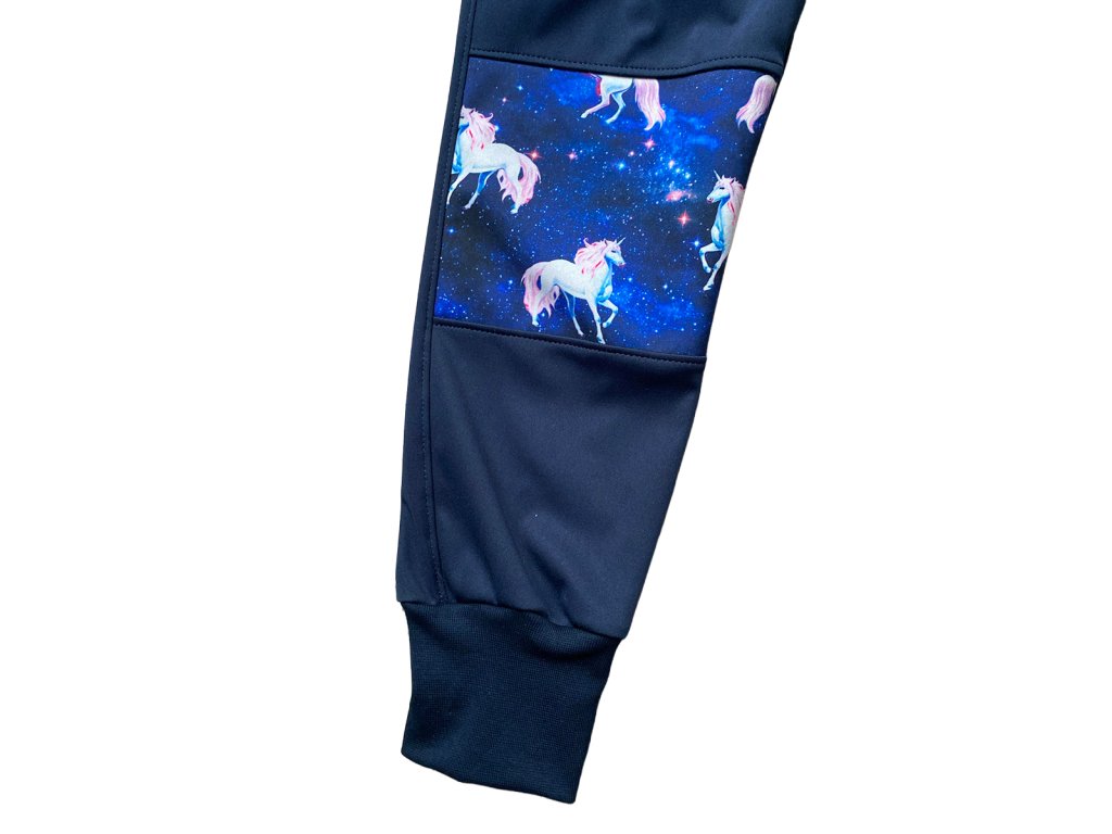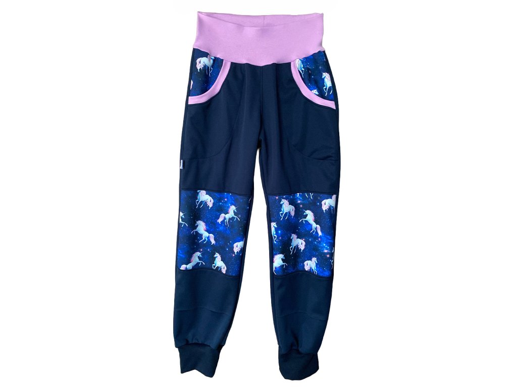 Dětské lehké softshellové kalhoty – letní/jarní – TMAVĚ MODRÉ S JEDNOROŽCI