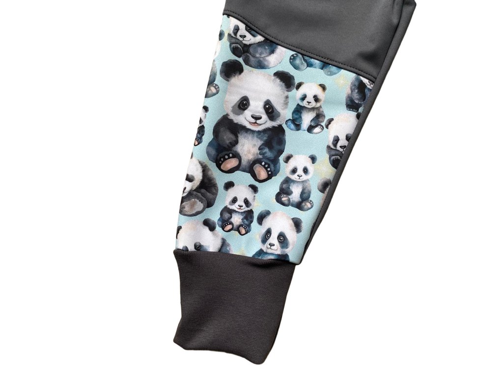 Dětské lehké softshellové kalhoty – letní/jarní – TMAVĚ ŠEDÁ S PANDAMI